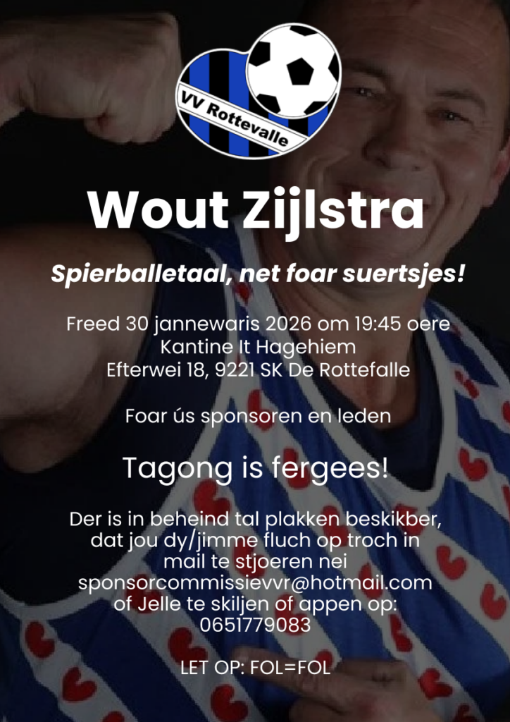 Op freedtejûn 30 jannewaris komt Wout Zijlstra yn de kantine om moaie ferhalen oer syn libben te fertellen. Wout wie yn 2001 de sterkste man fan Nederlân. Dr binne in beheind tal plakken beskikber, dat jou dysels gau op troch in appke te stjoeren nei Jelle Witteveen: 0651779083.