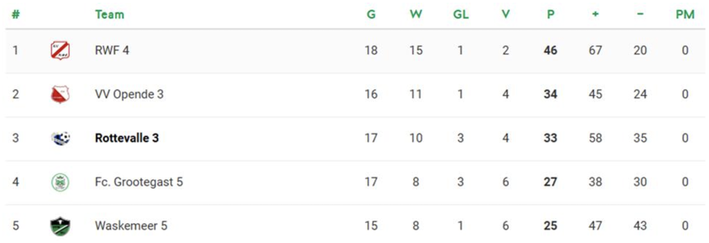 Troch dizze prachtige trije punten stiet Rottevalle 3 mei 33 punten út 17 wedstriden, mei seis punten foarsprong, moai op it tredde plak. RWF 4 liket mei in flinke marge kampioen te wurden, mar it twadde plak is noch wol in mooglikheid foar it Tredde. Opende 3 stiet hjirboppe, en de lêste wedstriid fan it seizoen is ek tsjin Opende 3.